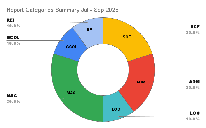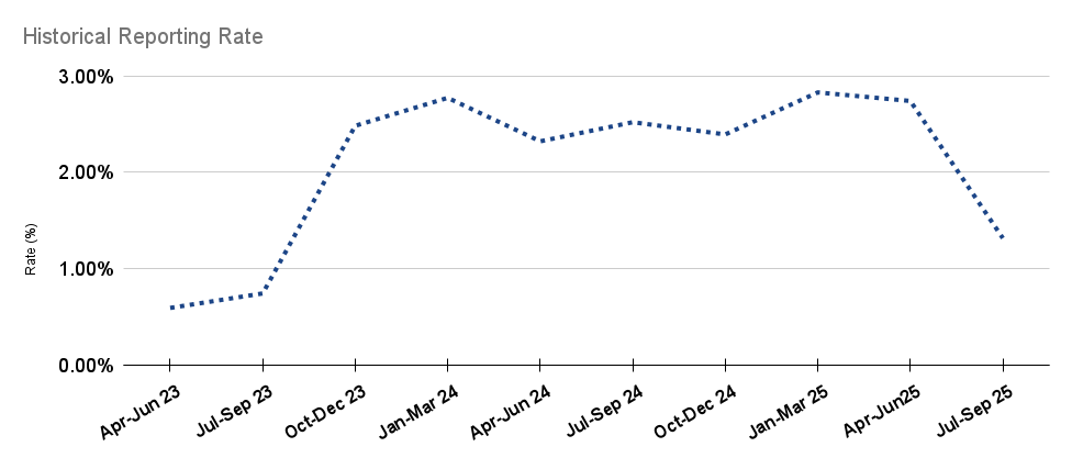 Between July and September, the reporting rate dipped to 1.3%, the lowest of the year. This can be potentially attribute to instructor turnover and the onboarding of new team members, where safety reporting awareness may not yet have been fully established. Continued updates like this one help to reinforce the importance of safety engagement across all roles and members in our club.