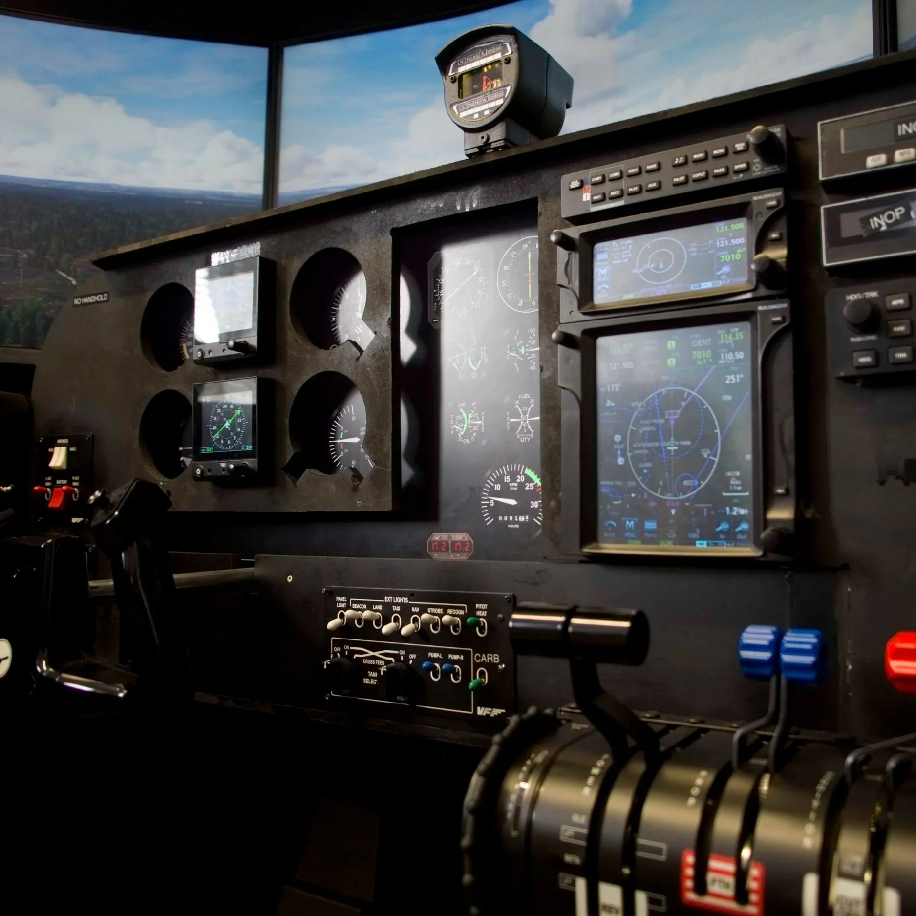 The simulator is fitted with Garmin G5 displays, a GTN650, and a GTN750, giving full RNAV capability with an up-to-date worldwide navigation database. This setup lets pilots use the same avionics they’ll find in many modern aircraft and practise real-world GPS navigation and procedures.
